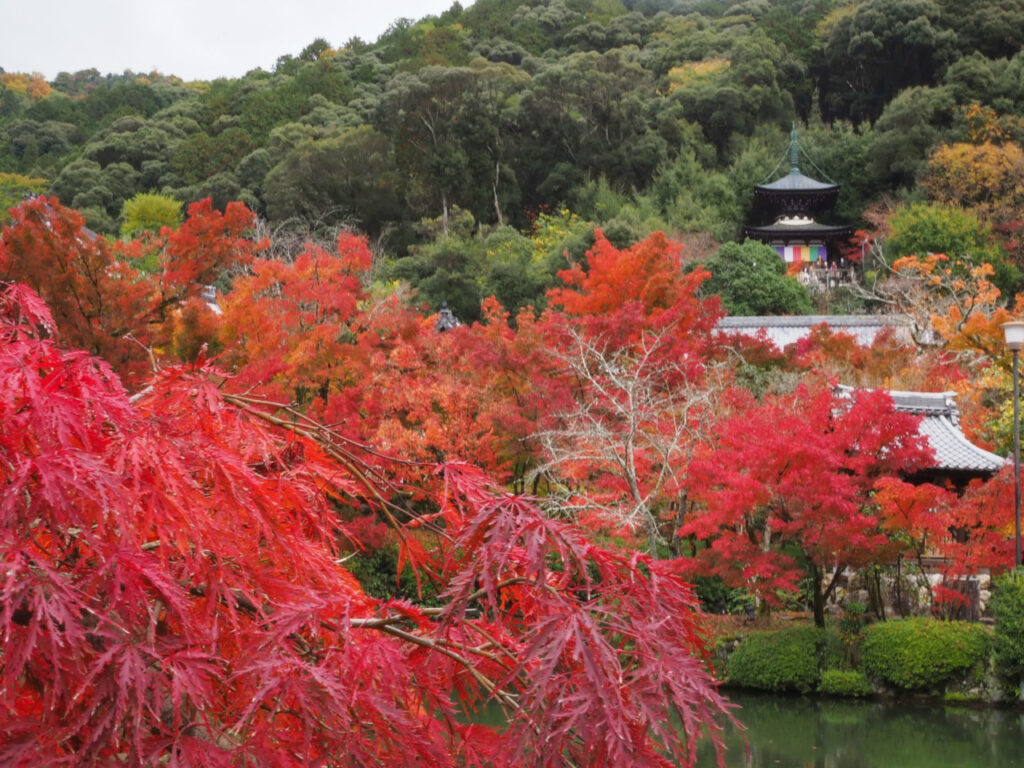【おすすめの理由】放正地を挟んで山上の多宝塔の風景を楽しめます。山中の紅葉が、多宝塔を包み込んでいる様子は絵巻物語を見ているかのよう。その他にも、池に浮かぶ弁天社にかかる錦雲橋と紅葉の風流な風景をカメラに収めることができたり、水面に映る逆さ紅葉を撮れたりと、色んな切り方で永観堂の紅葉を撮影できます。